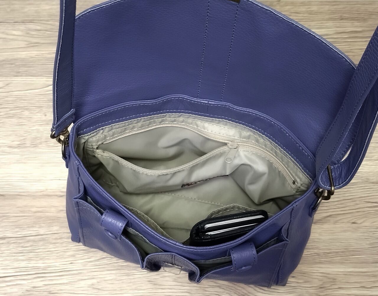 前面にはスマホやパスケース・小さめの財布などが入るポケットが2,本体内部には大き目のファスナーポケット1とパスケースサイズのポケットが2あります。