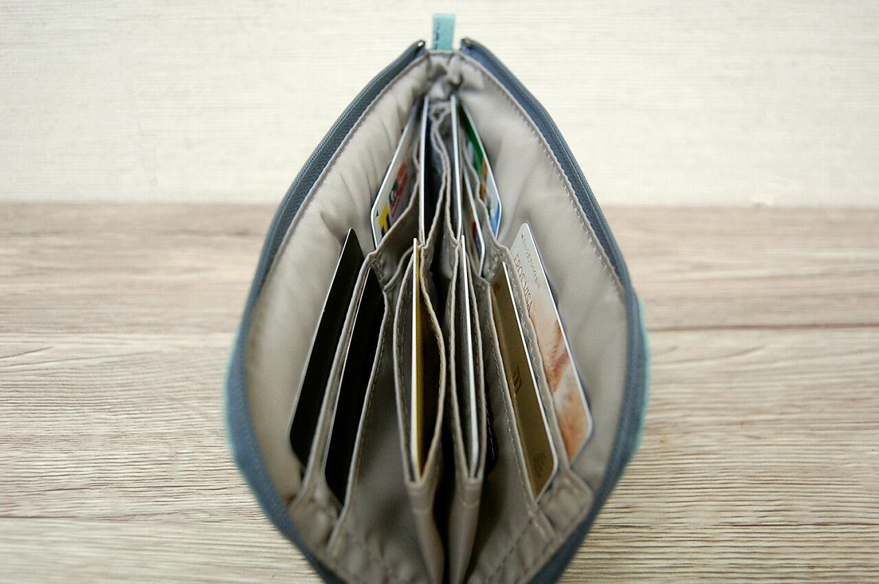 内部には片側4口、両サイドで8口、中央部にはふらしポケットの形で4口、計12口のカードポケットがあり、各ポケットに2枚づつ入れれば計24枚のカードが入れられます
